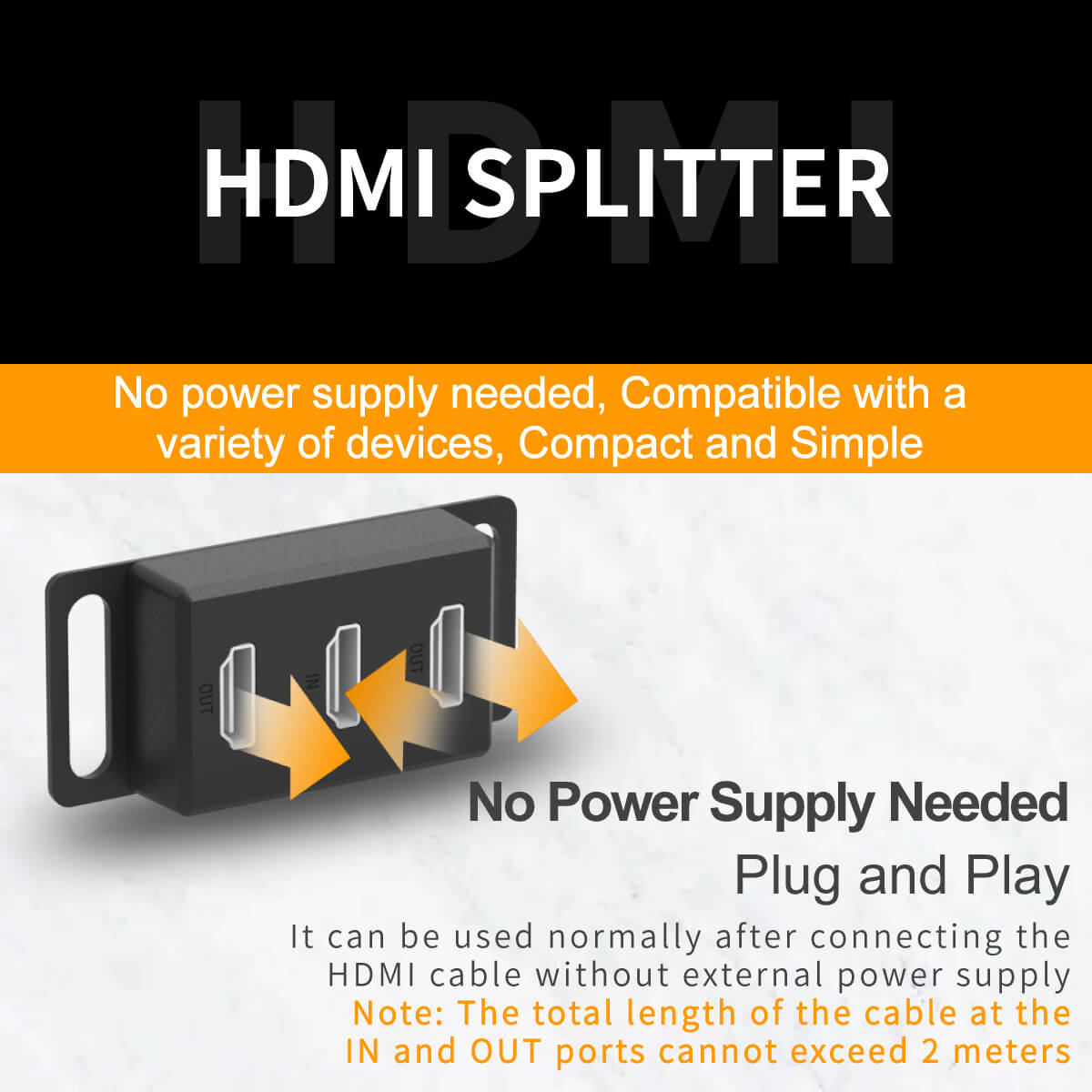 HDMI SPLITTER: Compact size and solid construction is easy to carry, this splitter helps you connect one HDMI sources to two HDMI display,